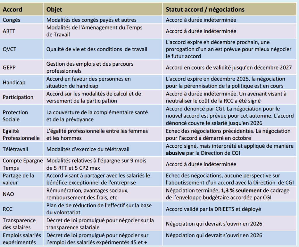 L’ensemble des accords de CGI est disponible sur l’intranet de CGI. Vous pouvez obtenir les textes des accords sur simple demande par mail à : cgi.cfecgc@yahoo.fr