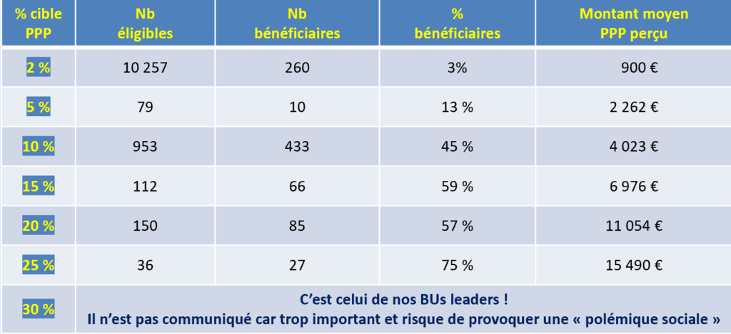 La formule est biaisée : pour conserver la performance qui convient à la rémunération de l’actionnaire, les objectifs des BU sont désormais surévalués année après année pour ne jamais atteindre les 100 % afin de ne plus déclencher le PPP « membres » (salariés). Alors aujourd’hui, nous disons : assez de cette usine à gaz qui prétend par un système de vases communicants, assurer aux uns, une rémunération variable individuelle essentielle à leur fonction et aux autres, un intéressement collectif aux résultats !